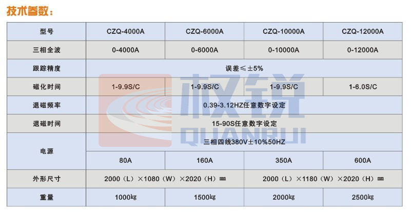磁化电流、磁化时间、退磁电流、退磁时间、退磁频率等参数可数字设定,数字显示。磁化电流闭环控制,自动跟踪。小电流控制精度好,分辨率高;过载、过温、过电路保护;运行监控报警并具有快速断电等功能,微机控制,采用双反星形带平衡点抗器结构。输出电流大,纹波细数小,探伤深度深。