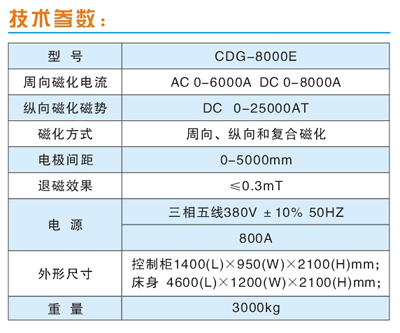 机电分体组合式结构,大规模集成电路微机半自动控制;交直流两用,周纵向复合磁化,电动或气动夹紧,翻滚转动观察;交流磁化带断电相位控制,磁化、间隙时间控制,超负荷自动保护等多种功能;各项技术性能完全符合美国、德国的航空和军工等部门的严格规范要求,可替代进口的同类设备。